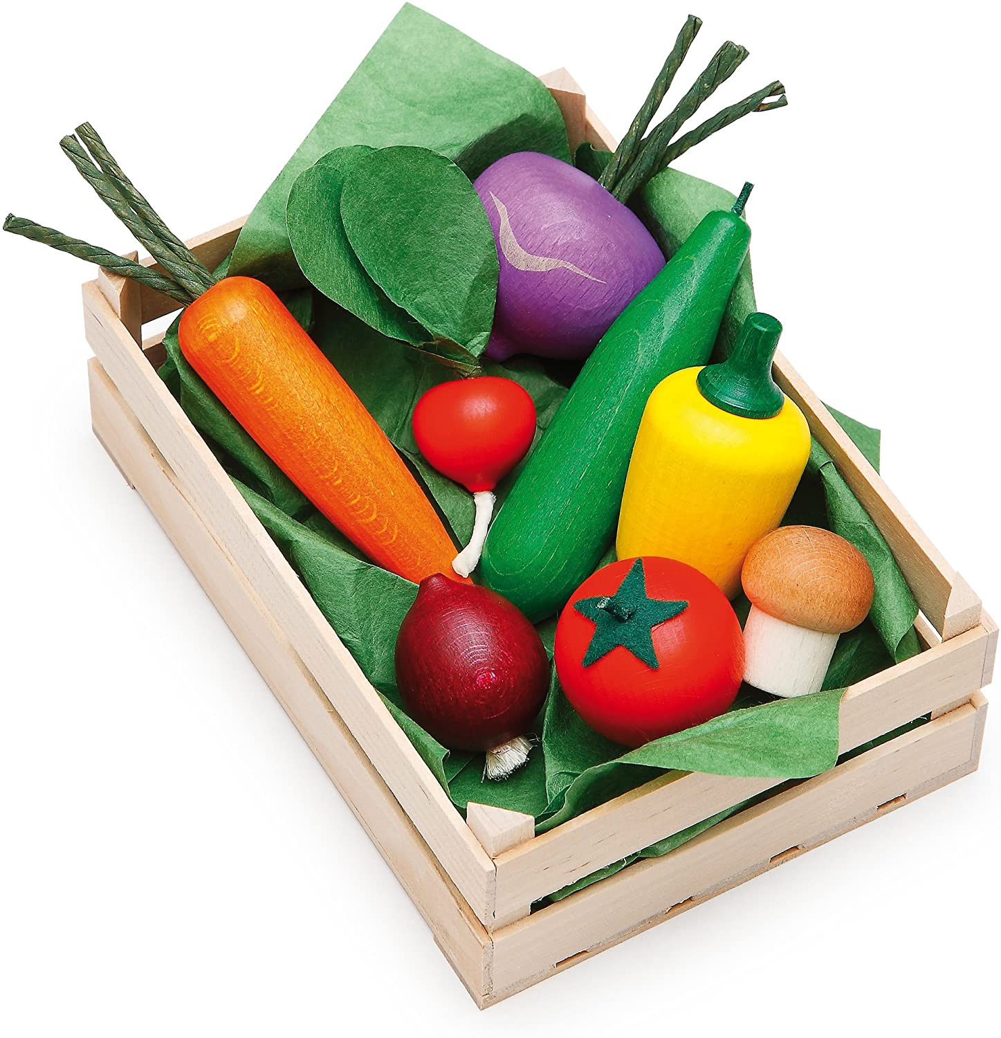 This crate contains the following vegetables from coloured laquered beech wood: 1 tomato, 1 carrot, 1 cucumber, 1 mushroom, 1 yellow pepper, 1 onion, 1 kohlrabi, 1 radish