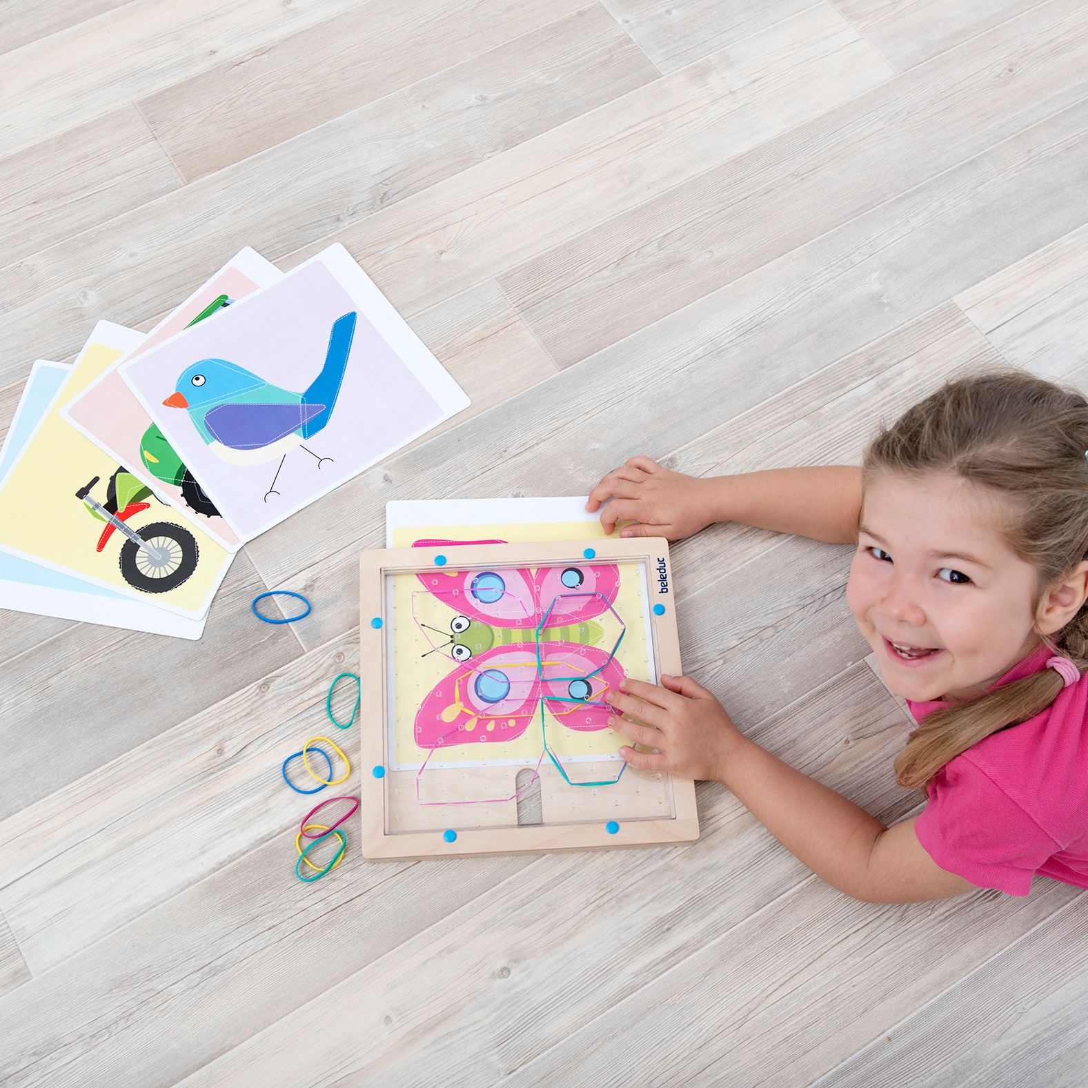 The coloured rubber bands give children the opportunity to create special works of art. No matter whether these are with or without templates cards – stretching the bands develops fine motor skills and promotes creative design.