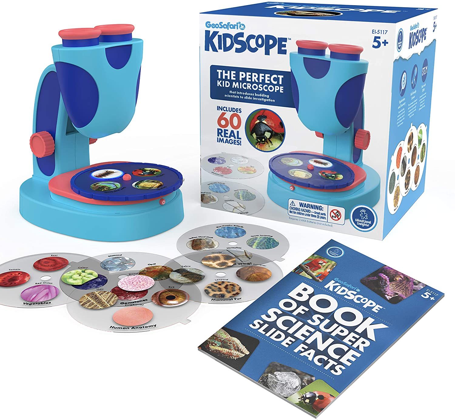 KidScope is an ideal children’s microscope to introduce budding young scientists to using real science tools. The KidScope comes with 60 high-quality magnified printed images on 15 easy-to-use slides that guarantee a successful viewing experience each time. Children can also place their own specimens directly onto the viewing stage and take a closer look through the microscope’s 3 x magnification.