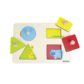 Who is hiding there? The knob puzzle Hide & Seek invites kids to discover which animal is hiding under the colourful shapes. They can learn to recognize the first geometrical shapes while playing with the pieces.