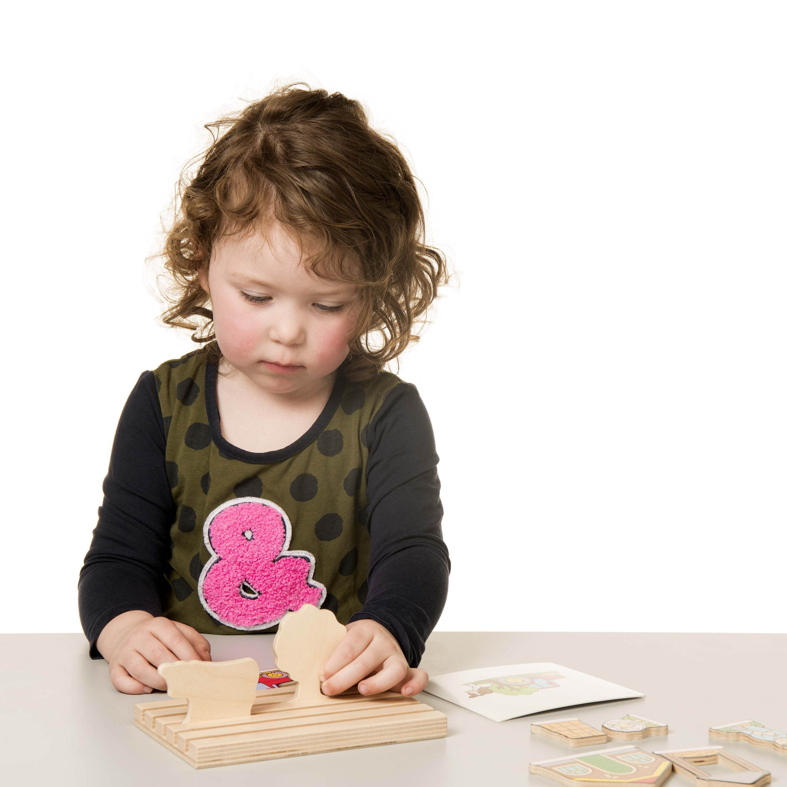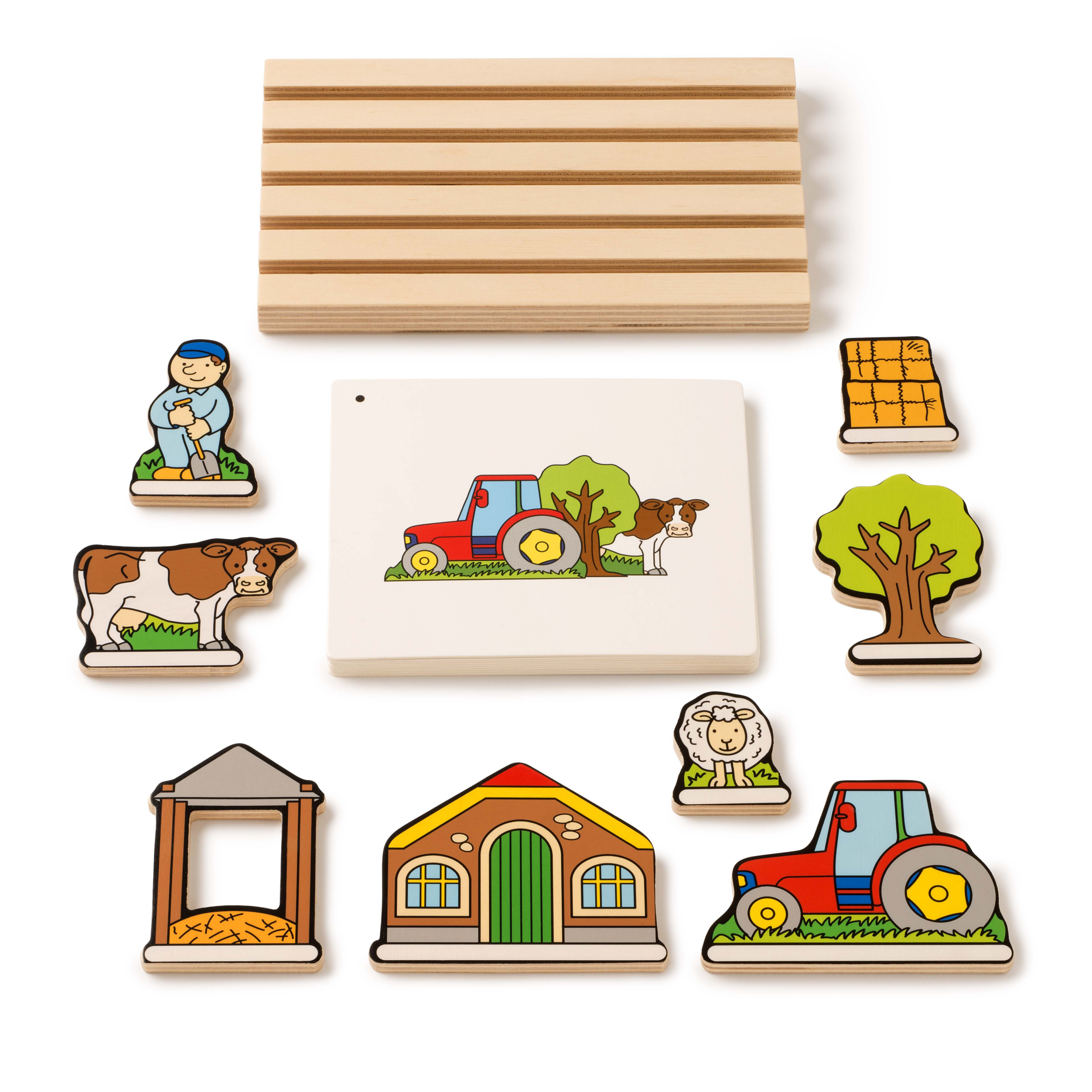 Place the items in the wooden stand as shown on the assignment cards or create your own story. Stimulate spatial orientation, vocabulary and storytelling.
