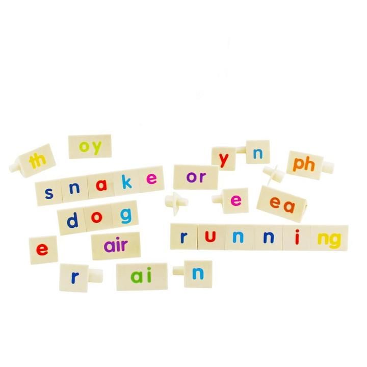 Build words with your Tri-Blocks tub and learn short vowels, long vowels, adjacent consonants, split digraphs, multi-syllabic words, and adding suffixes. Turn each Tri-Block and manipulate the middle sound (CVC or CVVC), change a blend ('sp' to 'sl' or 'st'), or change a spelling (y to i) when adding a suffix. Tri-blocks let you know your spelling rules by their colour-coding and their unique block orientations. Unique connector block included for building multi-syllabic words.